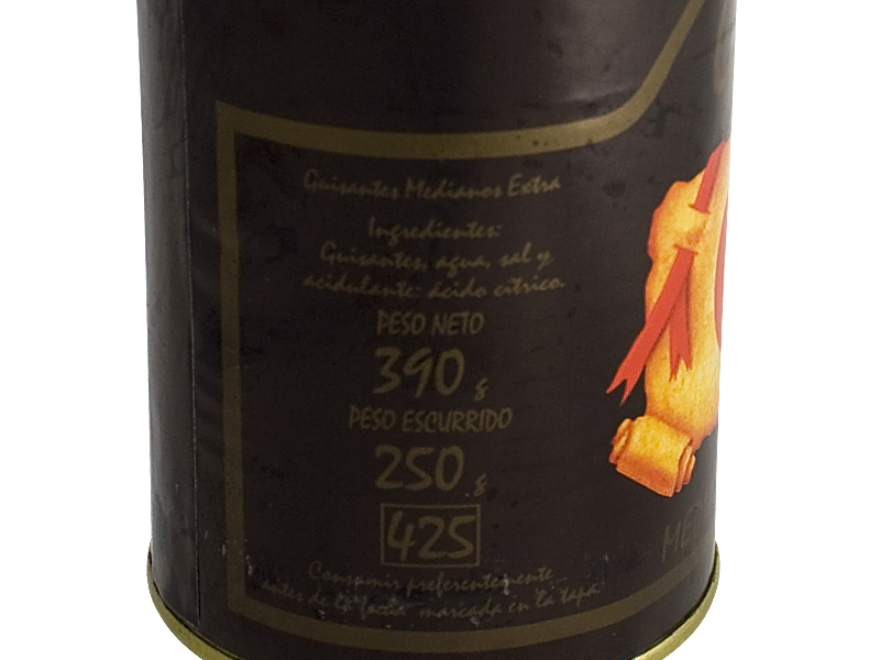 Guisantes medianos. Calidad Extra. Envase en lata. Peso escurrido 250gr, 425ml.