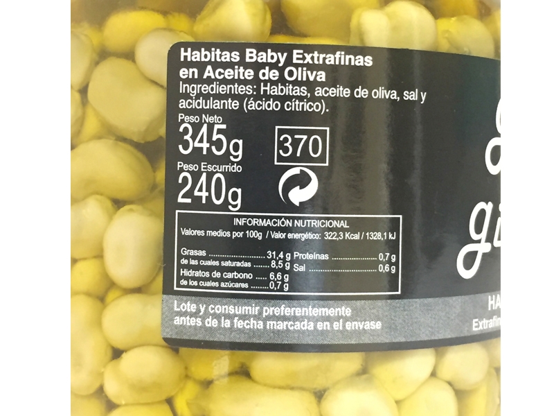 Habitas baby en aceite de oliva. Envase de cristal. Peso escurrido 240gr. 370ml. Producto de España.