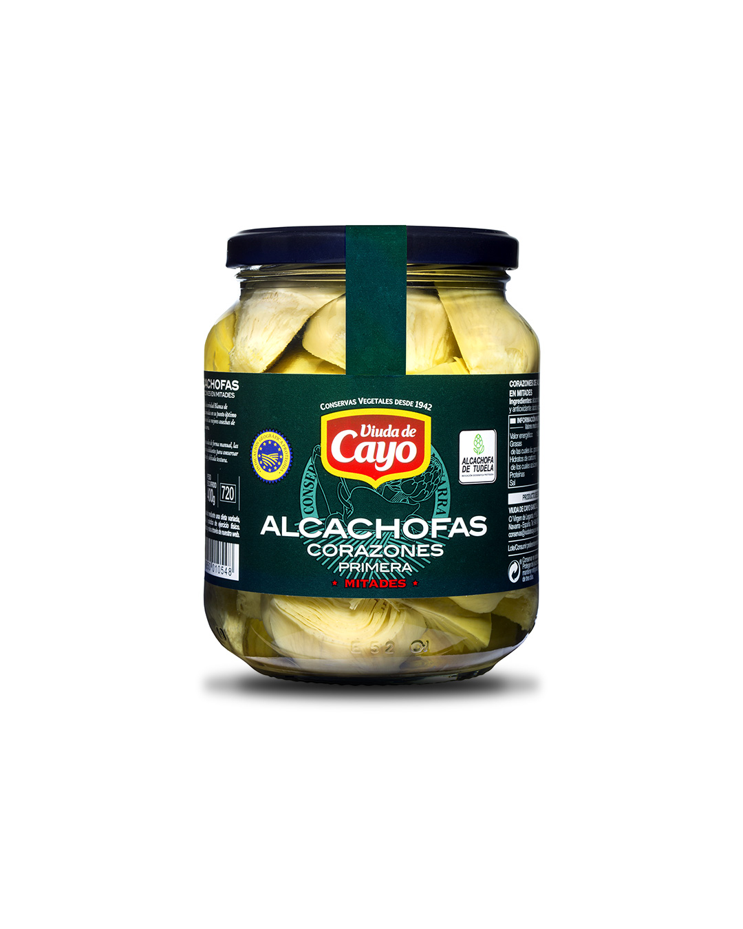 Alcachofas de la marca Viuda de Cayo, con Indicación Geográfica Protegida (I.G.P.) Alcachofa de Tudela, un producto garantiza la máxima calidad y respeto por el origen.