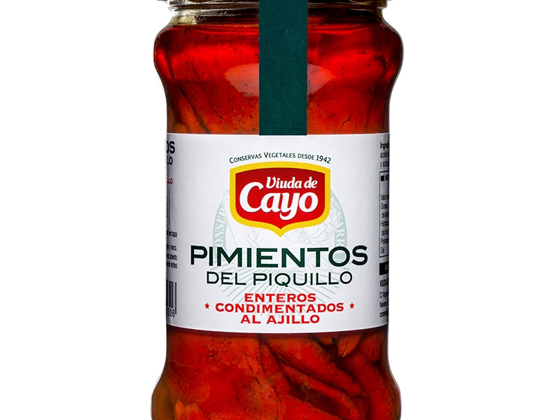 Pimientos del Piquillo condimentados al ajillo enteros. Envase de cristal. Producto de España.
